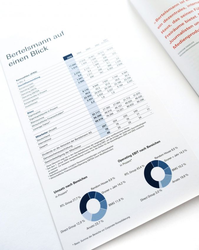 Konzept und Design für den Geschäftsbericht von Bertelsmann. Dieses Projekt entstand in Zusammenarbeit mit Kirchoff Consult AG.