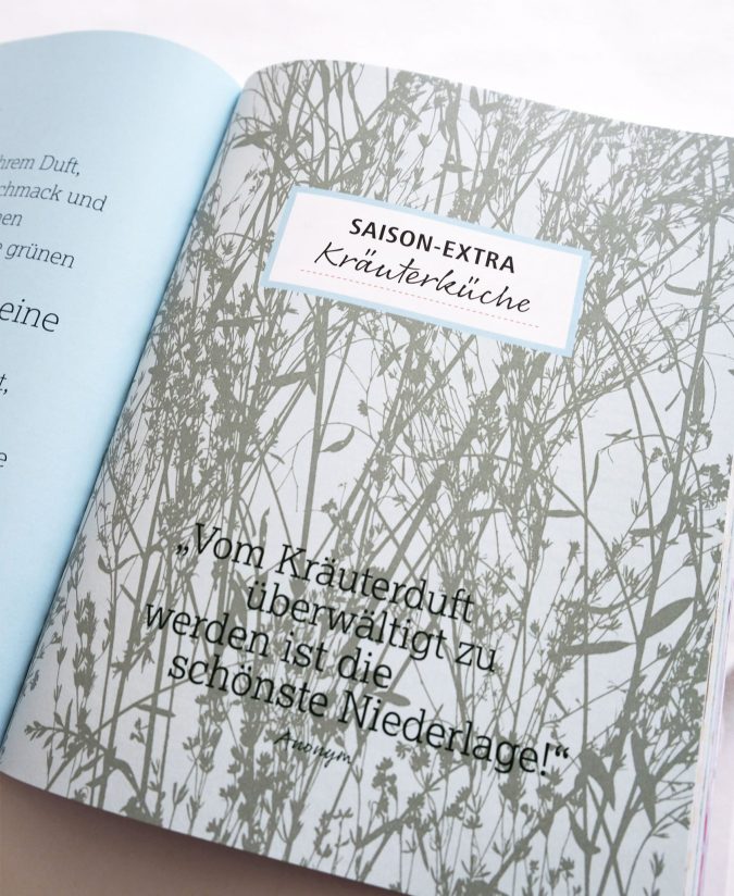 Entwicklung eines 4x jährlich erscheinenden Extraheftes für Gruner + Jahr (Redaktion Living at Home). Das Design erinnert eher an ein Buch mit der Möglichkeit selber verschiedenen Eintragungen vorzunehmen. Piktogramme zu den Rezepten helfen bei der Leserführung. Die Illustrationen sind handgezeichnet.